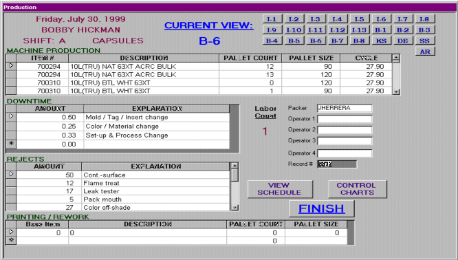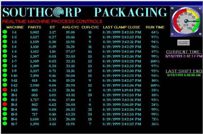 ActiveX controls, Realtime monitoring of production machinery (on-site or off-site), All functions automatic ie. Shift/Date changes, Parts made, Plant efficiency, Downtime calculations, permanent storage of all data for future reference.